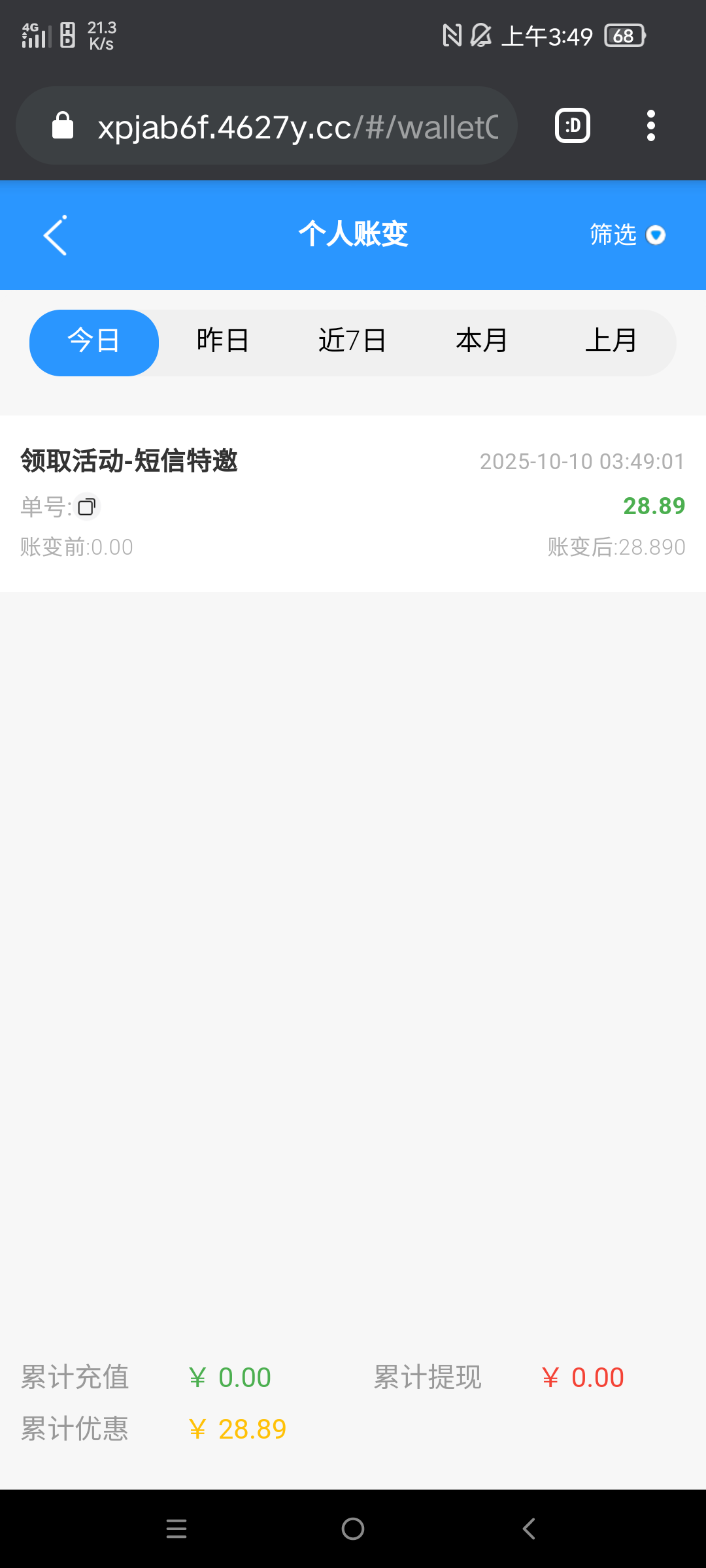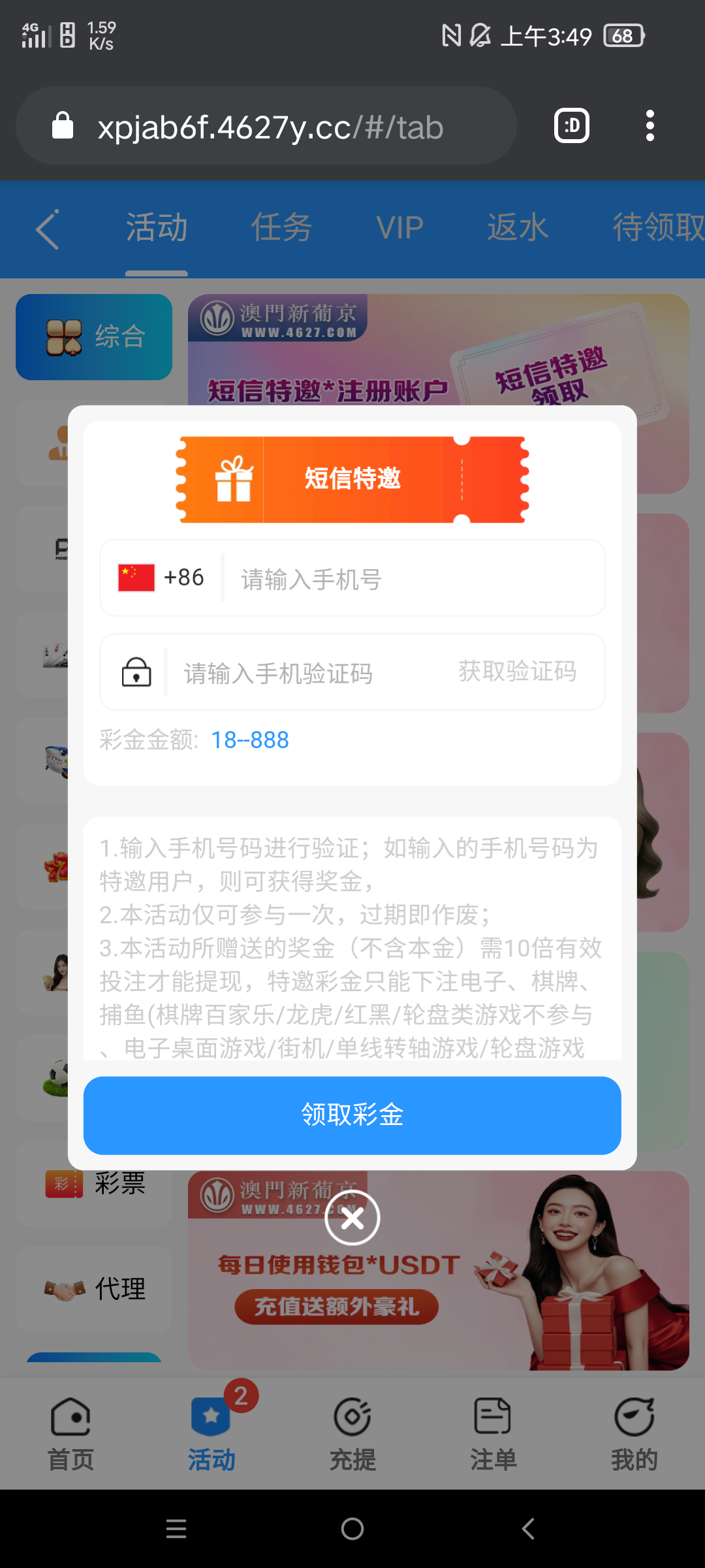 注册绑定,优惠中心自助手机号验证特邀彩金18-888我领了28,要求十倍流水300提现,出款自测