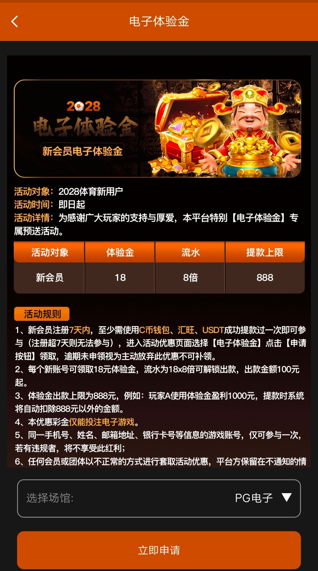 新人有出款记录的,活动专区申请电子体验金18元,8倍流水提款最低100元最高提现888元,具体看规则介绍,申请不到无视就好。